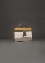 Crafted in pure metal with a fine fabric lining, leather details, and a full metal handle along with a leather detachable strap to be able to carry it handsfree, this piece is equipped for all. A matte finished gold top and a reflective silver base, this bag was crafted to be the talk of the town.