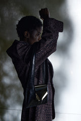 A long drop shoulder bag with a moulded metal flap with waves. Stores enough to take you from dusk to dawn. An easy slip-on and extremely light on the shoulders, this bag has been crafted with pleated sides to give more room without the extra bulk.