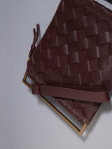Handcrafted with weaving together artisanal genuine calfskin leather joined along with side bars crafted in pure brass and stitched together with bonded nylon thread along with a golden YKK zipper.
