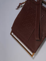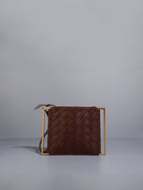 Meticulously handcrafted and intricately interwoven, this pouchette/sleeve showcases the artistry of handwork, adorned with eye-catching gold bars on either side. The reverse side of the sleeve is adorned with a pocket, showcasing Tann-ed's signature classic monogram. Secured with a zipper closure at the top, this elegant accessory is designed for both style and functionality. Additionally, it comes complete with a meticulously detailed wristlet, providing a convenient and comfortable grip for effortless carrying.
